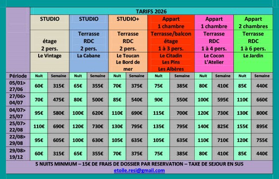 | Véhicule supplémentaire ( sous réserve de disponibilité) du 01/01/26 au 27/06/26 et du 29/08/26 au 19/12/26 | 10€ / jour |